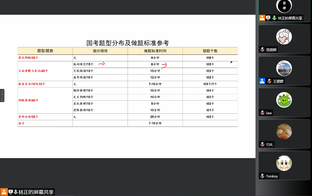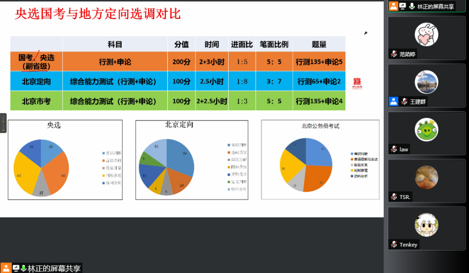 首先,林正老师介绍了央选、北京定向选调生、京考等公职类考试的笔试时间、笔试项目、报考岗位、报考人数、分数线的变化,帮助同学们了解了考试政策新动向。同时,林正老师指出,鉴于国考的题量及难度,建议各位同学尽早准备,有的放矢。